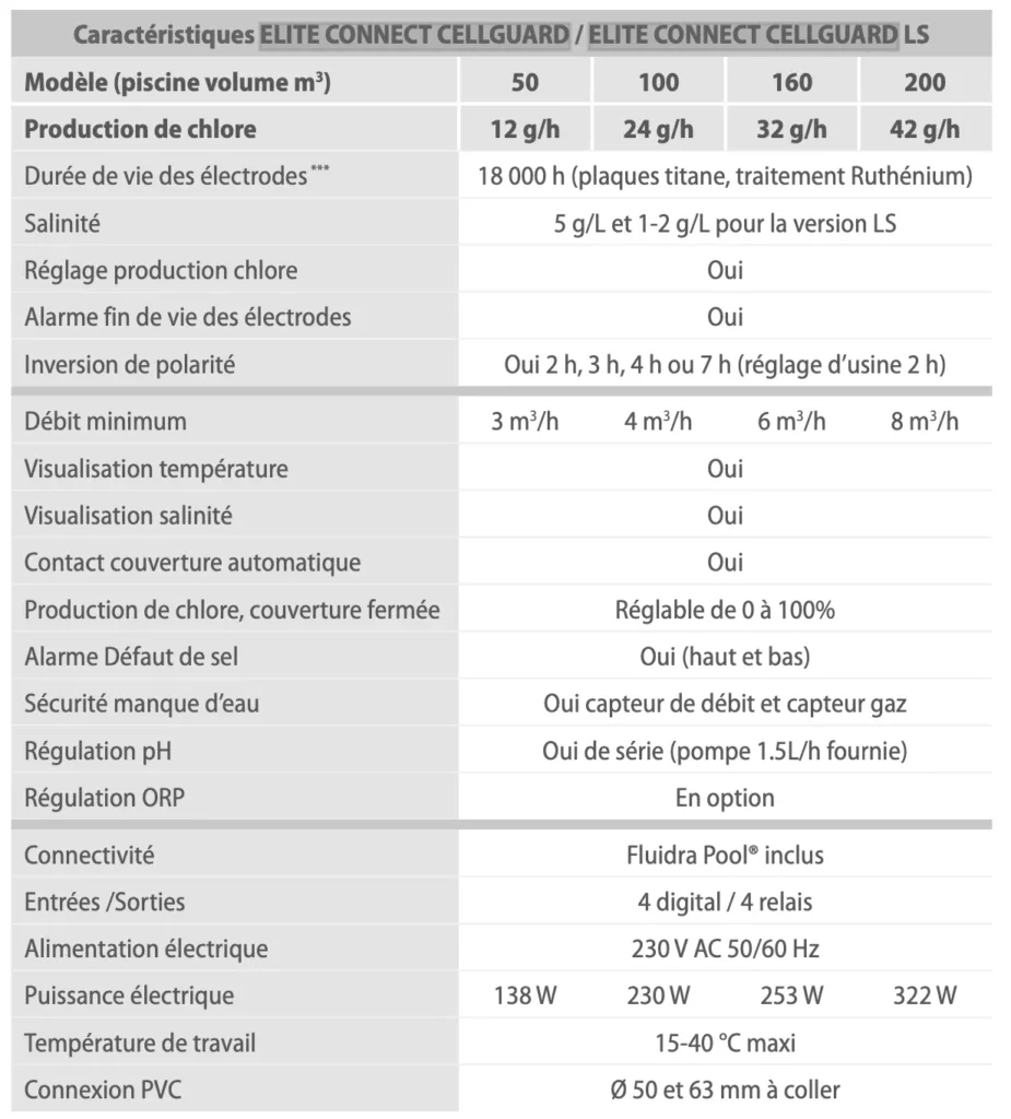 - Production de chlore (g/h) : 12 / 24 / 32 / 42