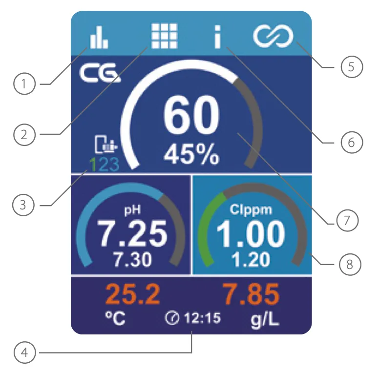 - Affichage/consigne de Chloration + (informations sur la vitesse de la pompe avec le module S-Driver VSP en option)