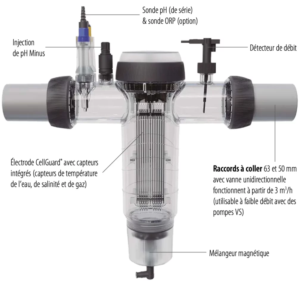 Electrolyseur au sel intelligent et évolutif incluant le contrôle des équipements de la piscine et la technologie brevetée CellGuard®.