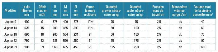 - Ø 480 mm, compatible avec toutes pompes de piscines jusqu’à 9,8 m³/h, avec vanne multivoies 1″ 1/2 Charge sable : 100kg